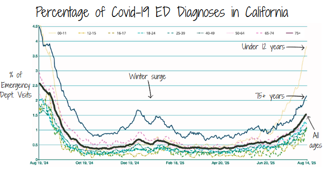 While Covid surges, RSV and influenza are still at flat summer-time levels. In California, RSV season tends to start in September, and flu typically starts rising in November. Both are well tracked by the CDPH respiratory weekly report. I’ll keep you informed.
