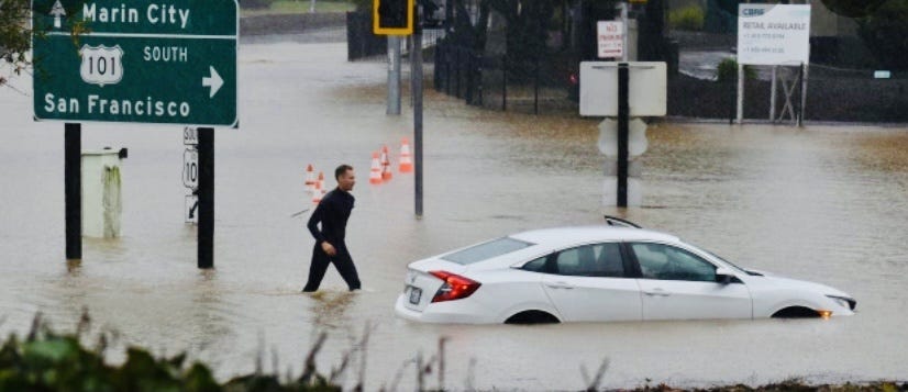 I saw this play out close to our home in Marin County a few days ago. Highway 101 was closed for hours as heavy rain runoff met high tides. Some neighbors experienced flooding of homes and garages; we live up a hill and were spared. That uneven, block-by-block impact is common during flood events.